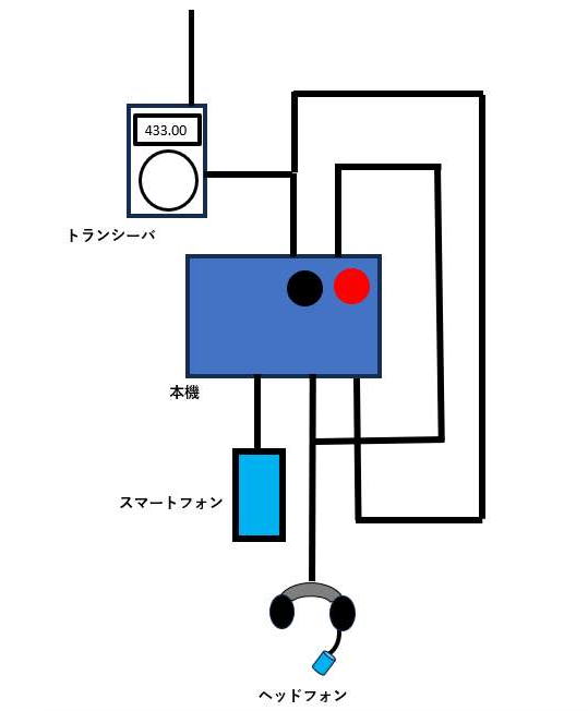先の写真のように2枚の基板で構成されてます。図1のように、ヘッドフォン、トランシーバ、スマートフォンを次の図のように接続します。