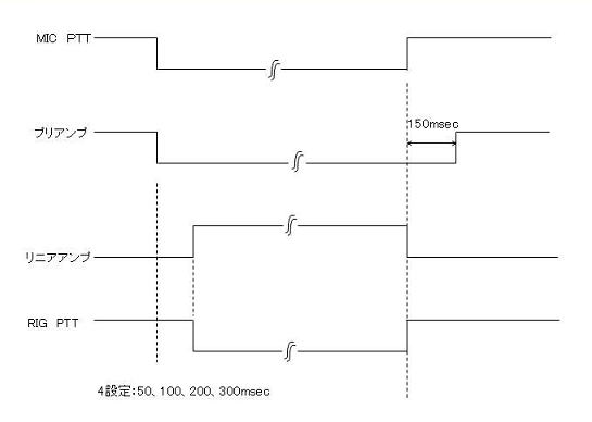 設定した時間に応じて、MICのPTTより(例えば100msec)遅延して、PTTリレー(PTT端子)、リニア出力をONします。