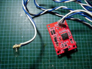 基板の左に見える黒い部品が、受光部です。リモコン波の送信に使用する発光部を取り付けます。
