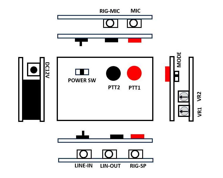 VR1は無線機への音声(変調)レベルを調整します。VR2はヘッドフォンに聞こえる音の大きさを調整します。